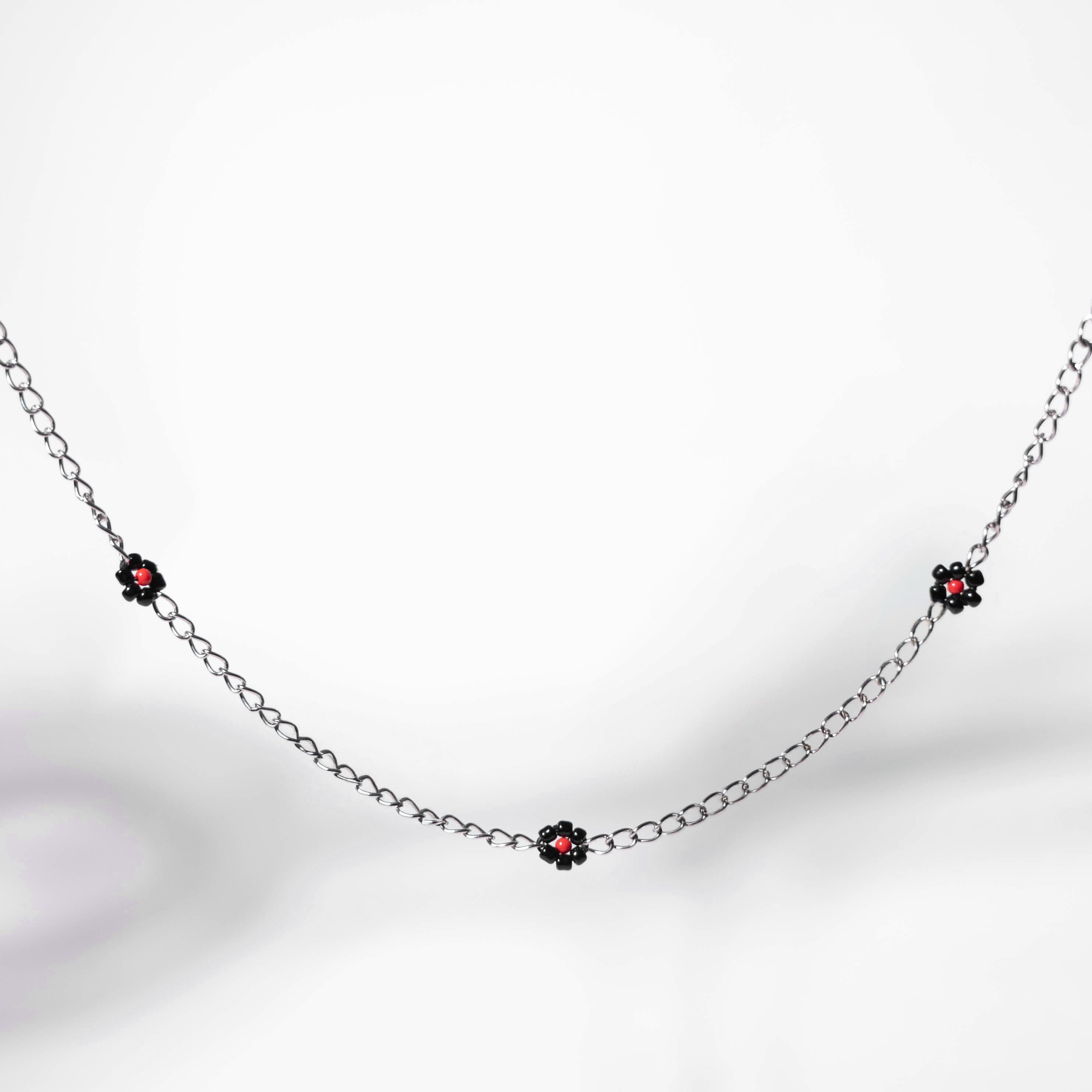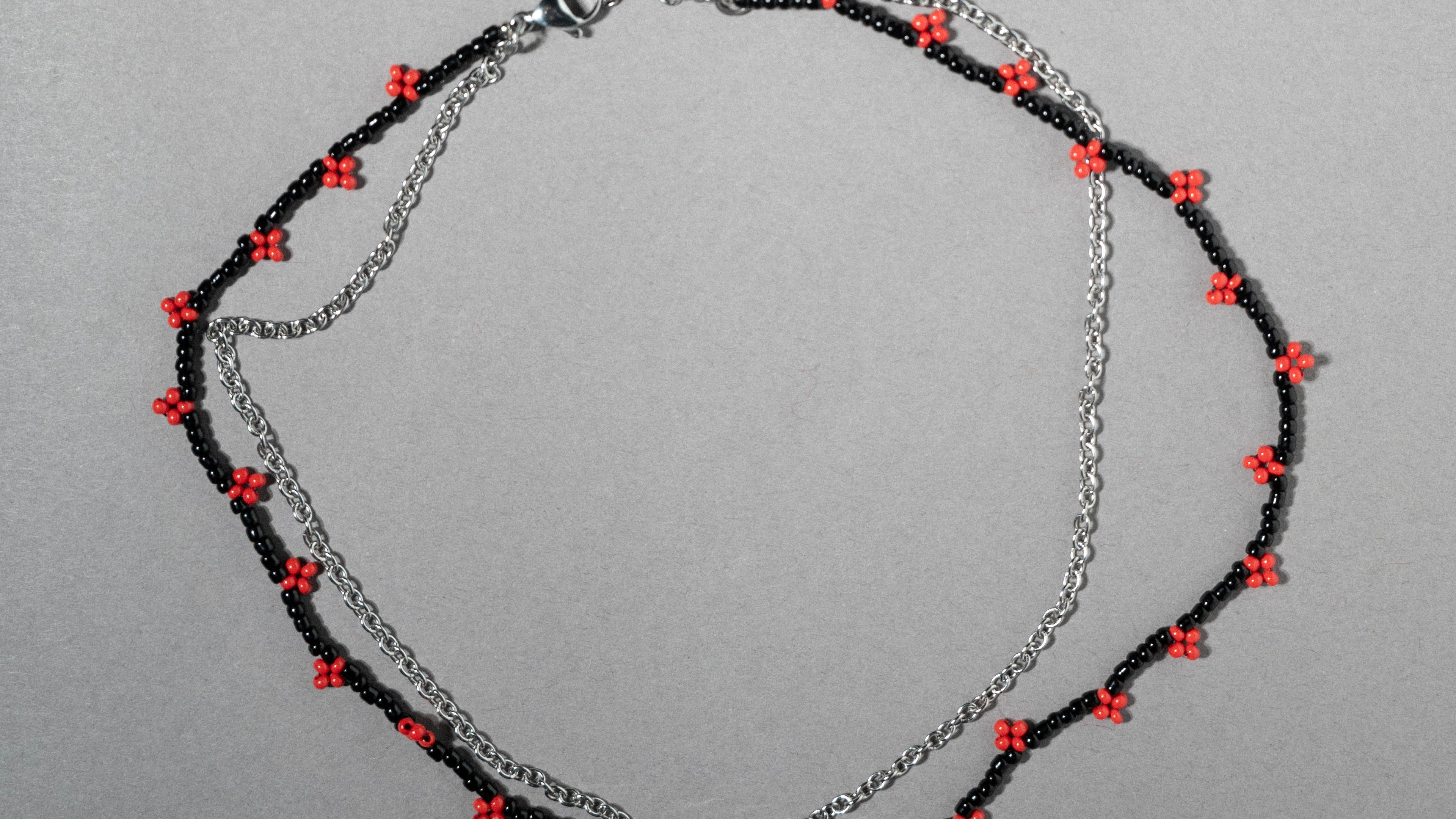Limited-edition chokers and necklaces from beads and stainless steel chains.